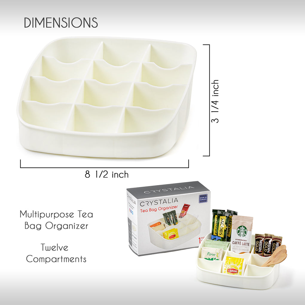 - TWELVE DIVIDED SECTION CONTAINER: Practical stackable design to help maximize your space. Twelve well-sized compartments provide plenty of space to store tea bags. Also used throughout the home to make storage of small items simple and easy - holds small office or school supplies, jewelry, keys, and more.